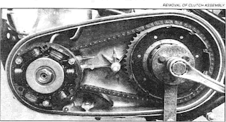 To remove the clutch unscrew the clutch spring pins. Lift away the spring caps, springs, clutch front plate, clutch pad in main shaft, the assembly of driving and driven clutch plates and the clutch retaining spring. The clutch sprocket can then be withdrawn along with the chain and engine sprockets (see point 10).
