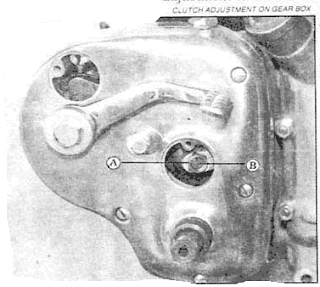To make the adjustment, remove the inspection cover, slacken the locknut and turn the central screw in to get the desired free play on the clutch lever at the handle bar end. Tighten.