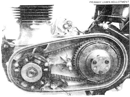 Remove the L.H. front foot rest, place a tray beneath the primary chain case to collect the oil in the chain case. Remove the central nut in the chain case outer and remove the cover.