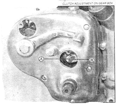 To make the adjustment, remove the inspection cover, slacken the locknut and turn the central screw in to get the desired free play on the clutch lever at the handle bar end. Tighten.